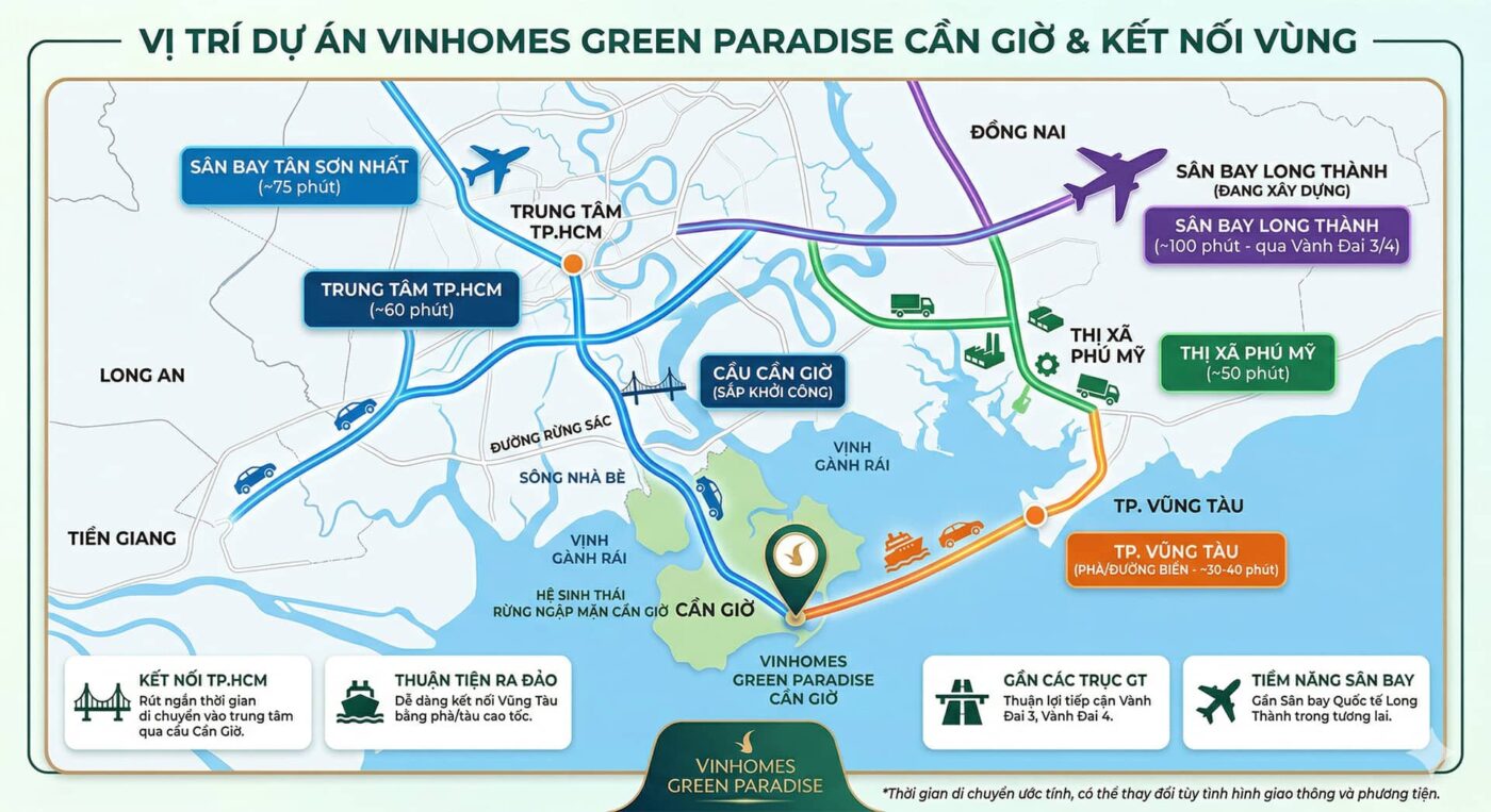 • Kết nối liên vùng: Gần sân bay quốc tế Long Thành (khoảng 30-40 phút sau khi hạ tầng hoàn thiện), cảng Cần Giờ (tương lai trở thành cảng trung chuyển quốc tế), và các tuyến đường thủy ven biển.